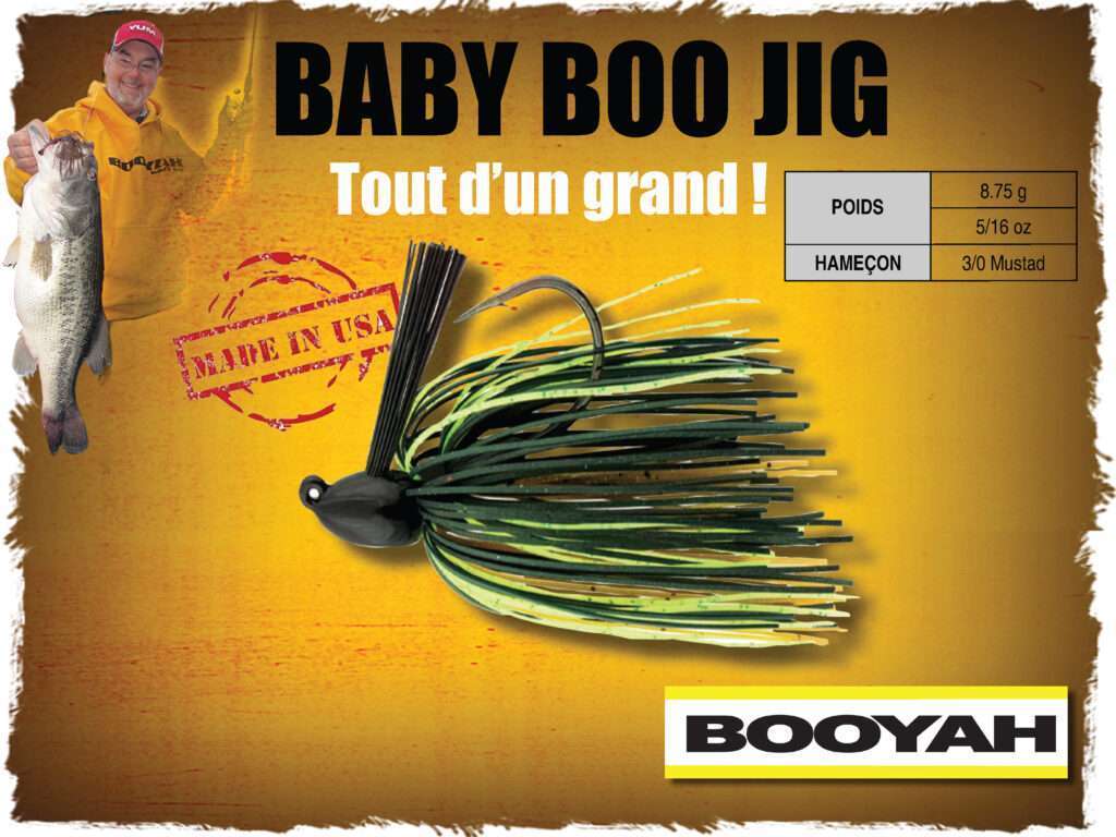 Le Baby Boo Jig Booyah pèse 8,75 g. Il possède une effilée de type obus. Elle présente un profil dont l’inclinaison est de 18 ° pour mieux fendre les végétations denses. La brosse anti-herbes en nylon est particulièrement dense. Elle protége au maximum l’hameçon. Ce Mustad® Black nickel est un forgé fort de fer. Cet hameçon au redoutable piquant « Ultra Point® » est relevé à 45 °. Il limite ainsi les accrochages sur le fond et donne une parfaite présentation du trailer. Le top pour du bottom taping dans les zones à végétation dense !