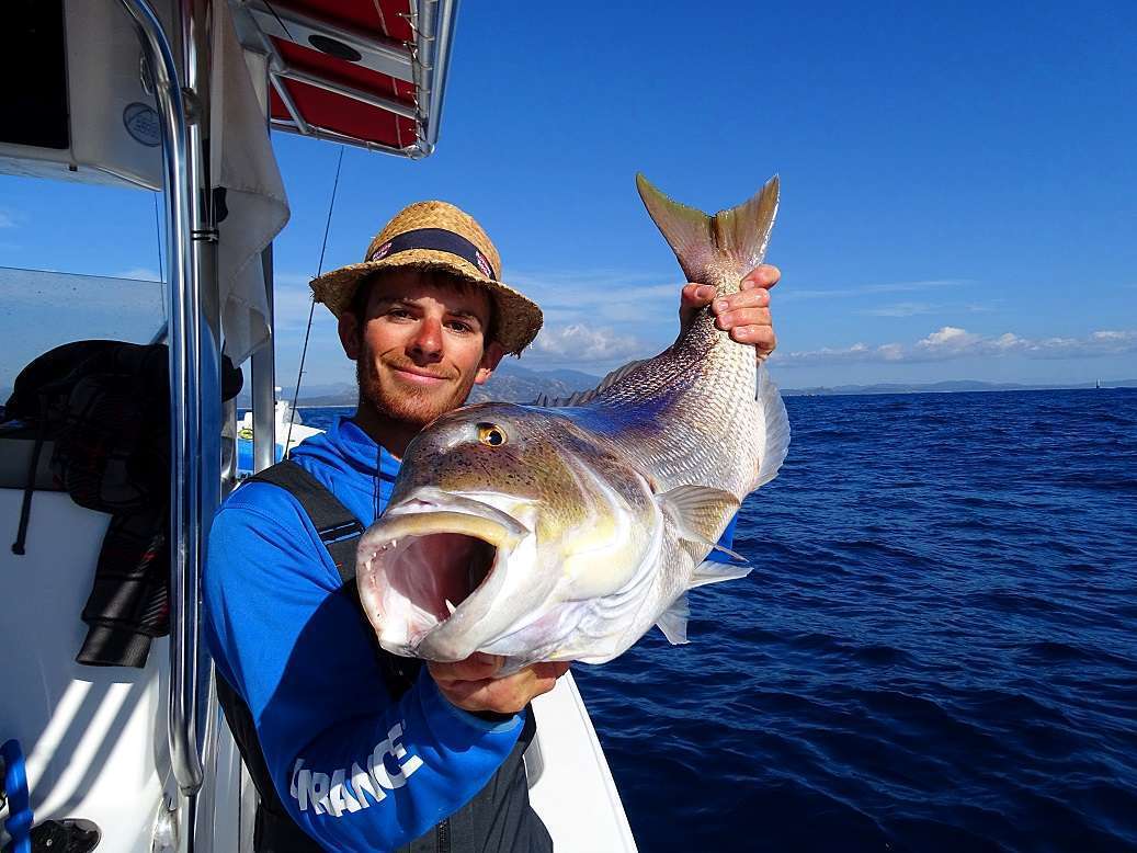 Chacun touchera du poisson mais nous en raterons beaucoup, suite à des décrochages et des casses. Même avec du 60/100 « Magix Fluoro » nous n’arrivons pas à arrêter certains sous-marins qui vont se frotter dans les roches, parfois à plus de 100m de fond !