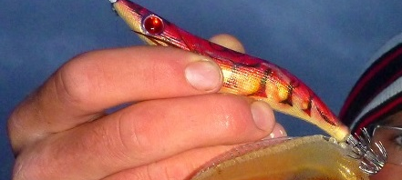 Ses éclats lumineux très proches de ceux renvoyés par les vrais poissons peuvent se révéler très importants. J’ai par exemple fait des sessions de nuit où la lune était masquée, les turluttes oranges et roses fonctionnait alors bien. Puis les nuages s’écartent et la lune apparait, et là, plus de touche ! Je change de modèle et mets une turlutte au coloris naturel mais avec un revêtement brillant, et les touches reviennent aussitôt ! Puis rebelote de nouveau des nuages et ma turlutte brillante ne prend plus. Il faut donc prendre en compte la luminosité qu’il peut y avoir sous l’eau et jouer entre turluttes phospho, neutre ou avec des reflets.